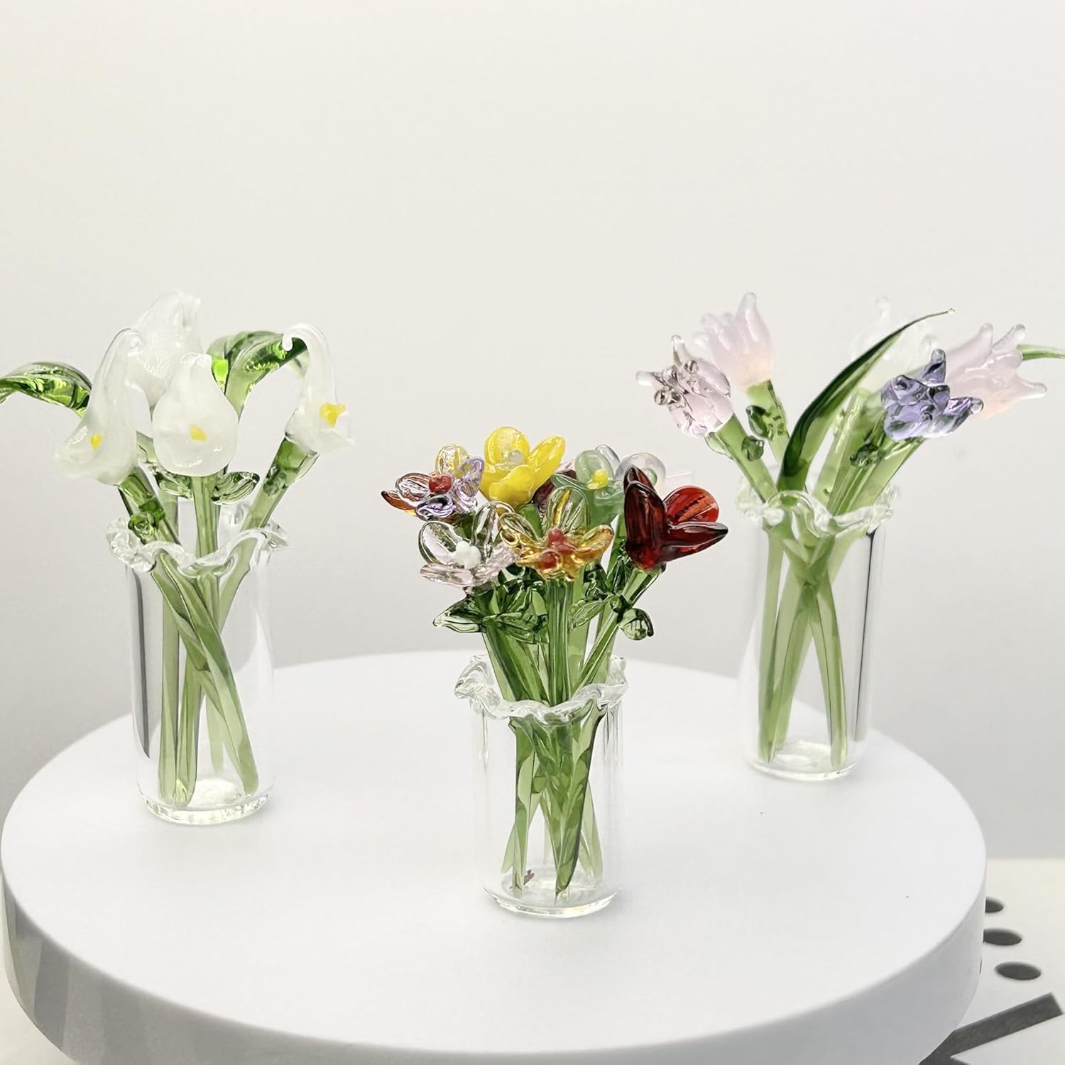 - Package Include : Package includes 11 pieces mini glass flower bouquet ornaments, include 1pcs flower vase,10pcs glass flower .Cute appearance will be welcomed by everyone, add more spring atmosphere in your home.
